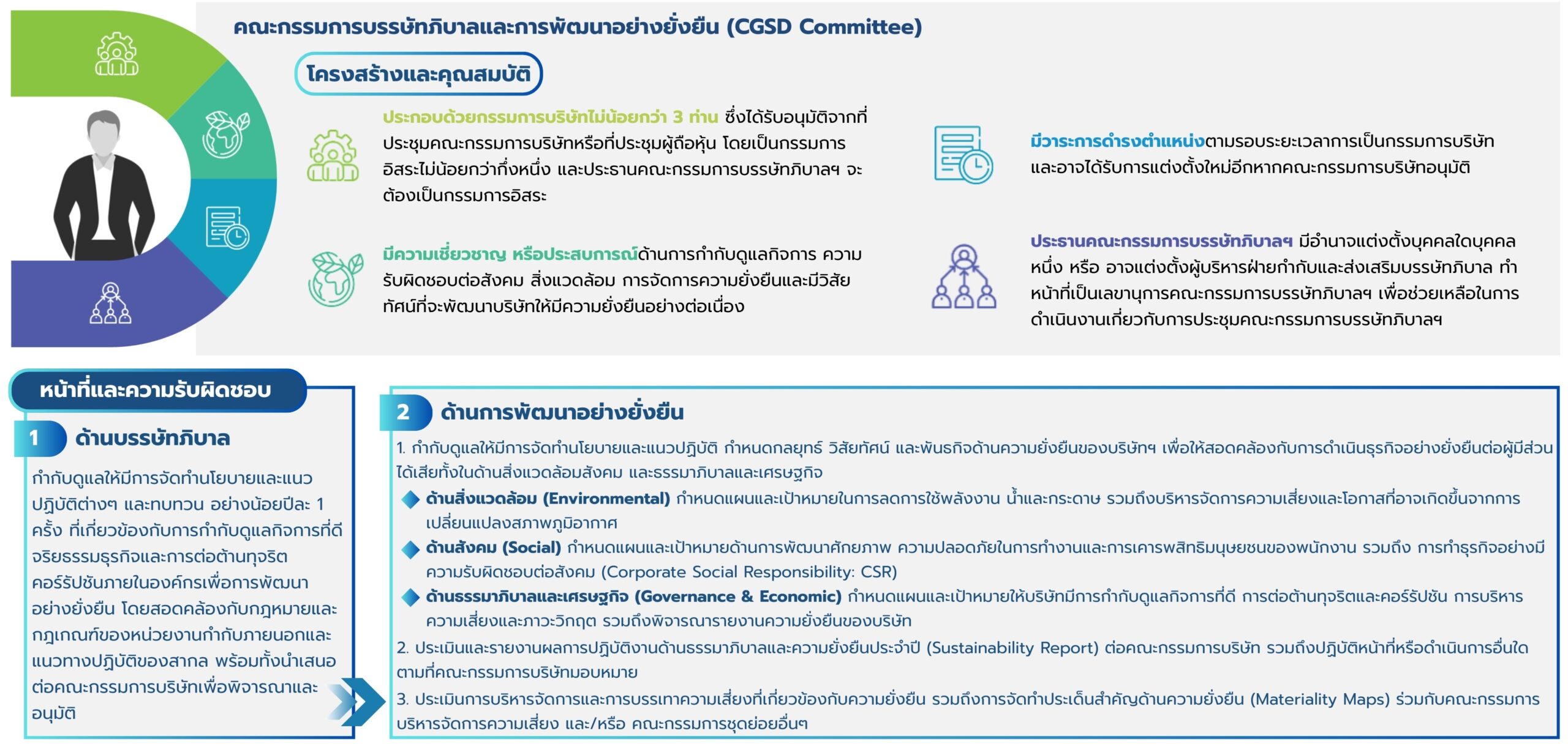 บริษัท เมืองไทยประกันภัย จำกัด (มหาชน) ได้แต่งตั้งคณะกรรมการบรรษัทภิบาลและการพัฒนาอย่างยั่งยืน (CGSD Committee) ตามมติที่ประชุมคณะกรรมการบริษัท เมื่อวันที่ 27 กุมภาพันธ์ 2567 มีหน้าที่กำหนดทิศทางและเป้าหมายเชิงกลยุทธ์ตามนโยบาย และกรอบแนวทางด้านความยั่งยืนของบริษัท เสนอความเห็นและแนวทางการบริหารจัดการด้านความยั่งยืนแก่คณะทำงานชุดย่อย และฝ่ายงานที่เกี่ยวข้อง ติดตาม พิจารณา และรายงานผลการดำเนินงานต่อคณะกรรมการบริษัท เพื่อให้บริษัทฯ เป็นองค์กรที่ดำเนินธุรกิจอย่างรับผิดชอบต่อสังคม มีความโปร่งใส เป็นธรรม สร้างความเชื่อมั่นต่อผู้มีส่วนได้เสียทุกกลุ่ม และพัฒนาให้บริษัทไปสู่การเติบโตอย่างยั่งยืน