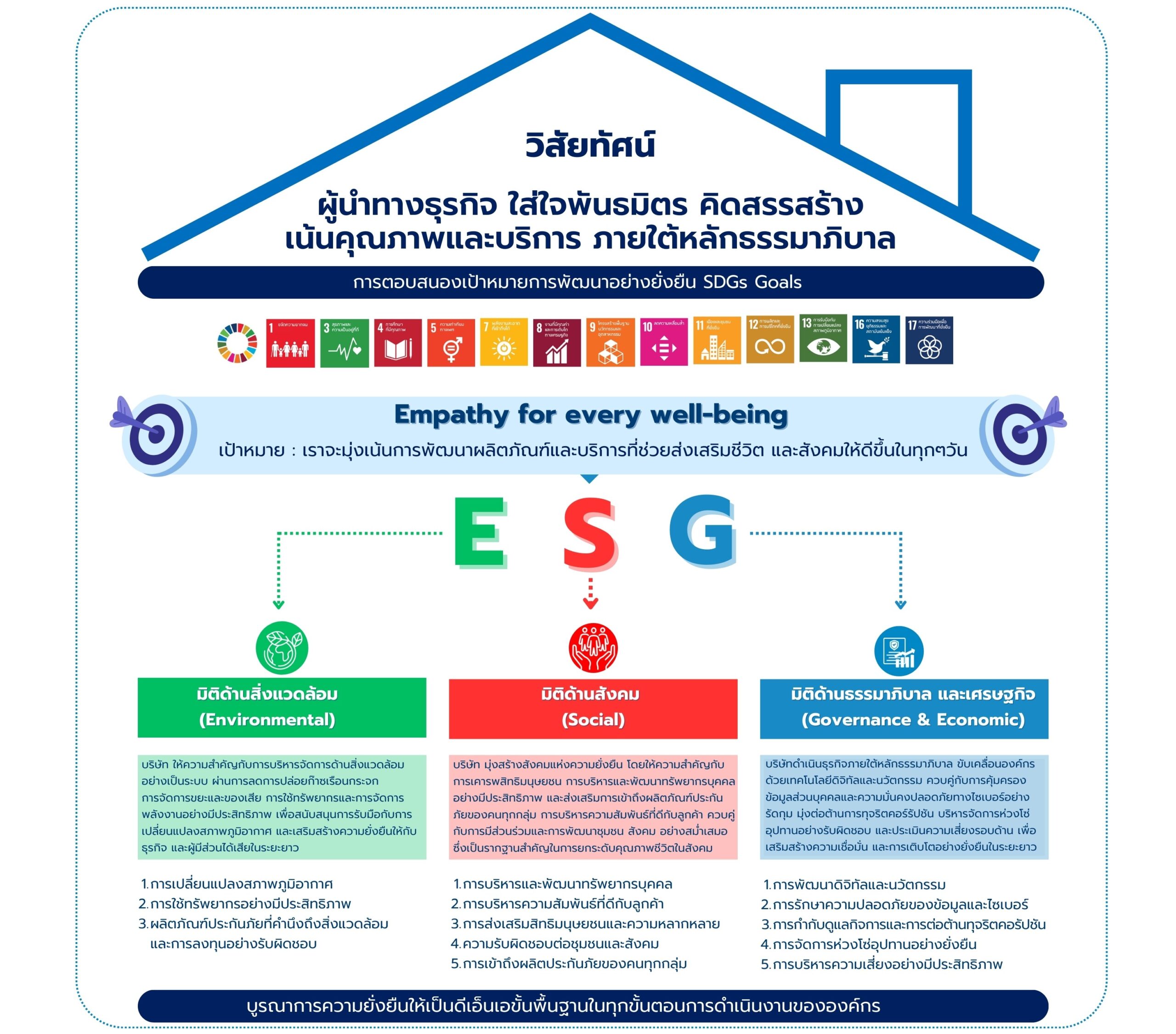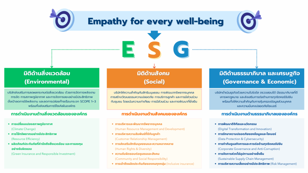 บริษัทได้ตั้งเป้าหมายการขับเคลื่อนการดำเนินงานด้านความยั่งยืนภายใต้แนวคิด “Empathy for every well-being” คือ เราจะมุ่งเน้นการพัฒนาผลิตภัณฑ์และบริการที่ช่วยส่งเสริมชีวิต และสังคมให้ดีขึ้นในทุกๆวัน จึงได้กำหนดกรอบกลยุทธ์การขับเคลื่อนธุรกิจเพื่อความยั่งยืนบนพื้นฐานการกำกับดูแลกิจการที่ดี (Good Corporate Governance) และการดำเนินธุรกิจภายใต้หลักความยั่งยืน ครอบคลุมประเด็นสาระสำคัญในด้านสิ่งแวดล้อม สังคม ธรรมาภิบาลและเศรษฐกิจ Environmental Social Governance and economic (ESG) เชื่อมโยงกับแผนการดำเนินงานของฝ่ายงานต่าง ๆ ที่เกี่ยวข้องโดยแบ่งออกเป็น 3 มิติ