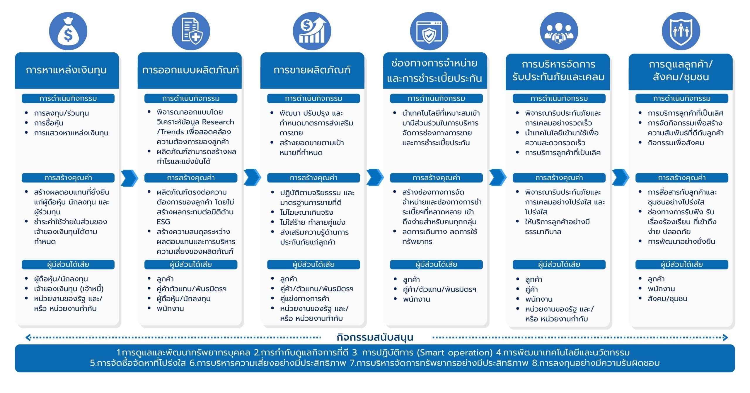 การดำเนินธุรกิจของ บริษัทเมืองไทยประกันภัย มีกิจกรรมที่ส่งผลกระทบต่อผู้มีส่วนได้เสียทั้งทางตรงและทางอ้อม ดังนั้นเพื่อให้เกิดการสร้างโอกาสและบรรเทาผลกระทบจากกิจกรรมในการดำเนินธุรกิจ รวมทั้งเพื่อให้การดำเนินธุรกิจเป็นไปอย่างยั่งยืน บริษัทเมืองไทยประกันภัยจึงได้ทำการวิเคราะห์ห่วงโซ่คุณค่าของธุรกิจ เพื่ออธิบายลักษณะและกิจกรรมของธุรกิจดังนี้