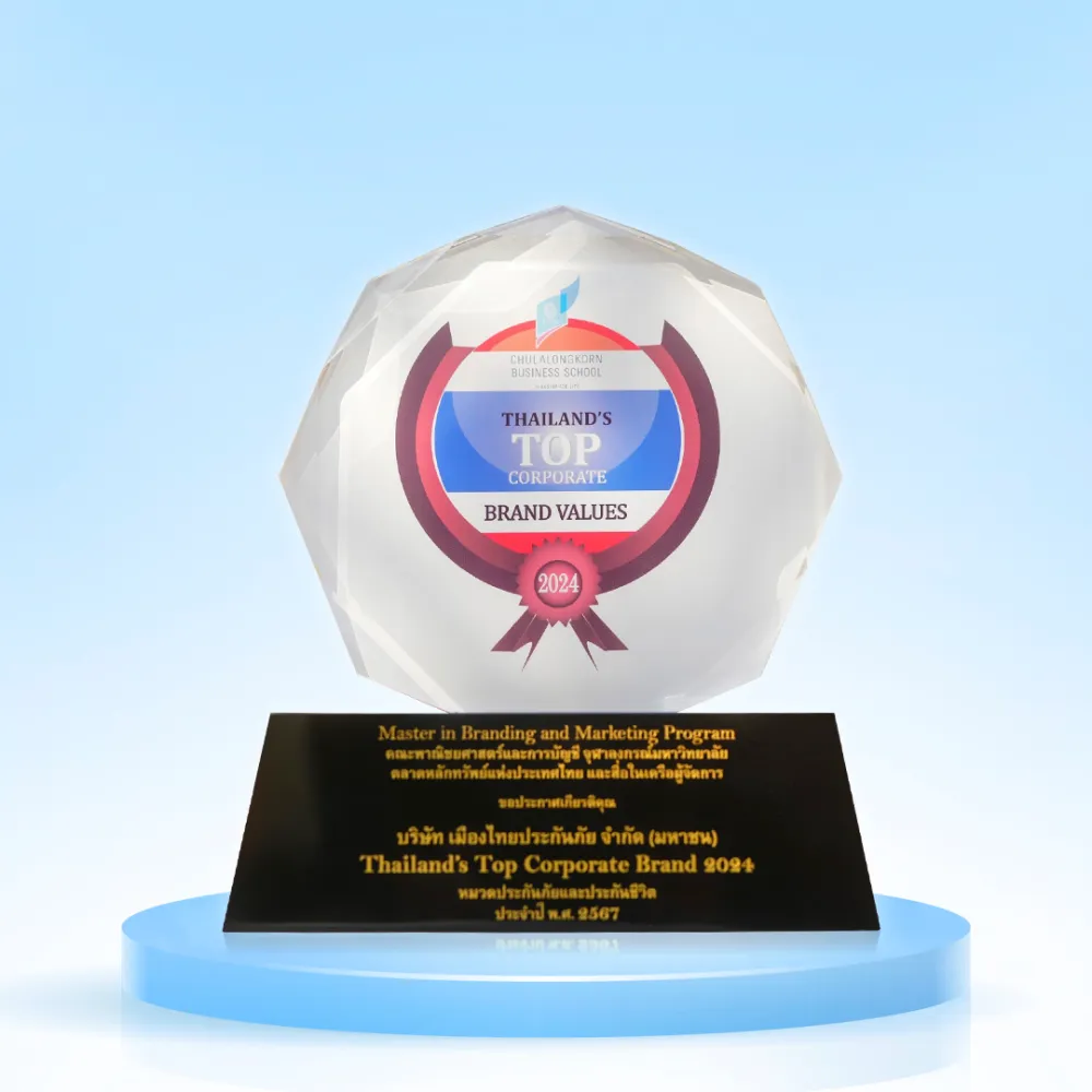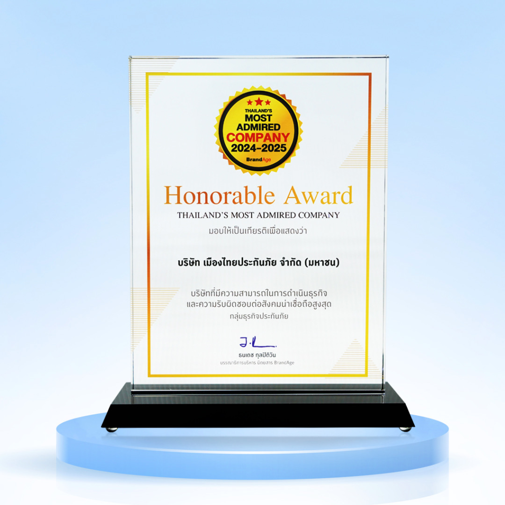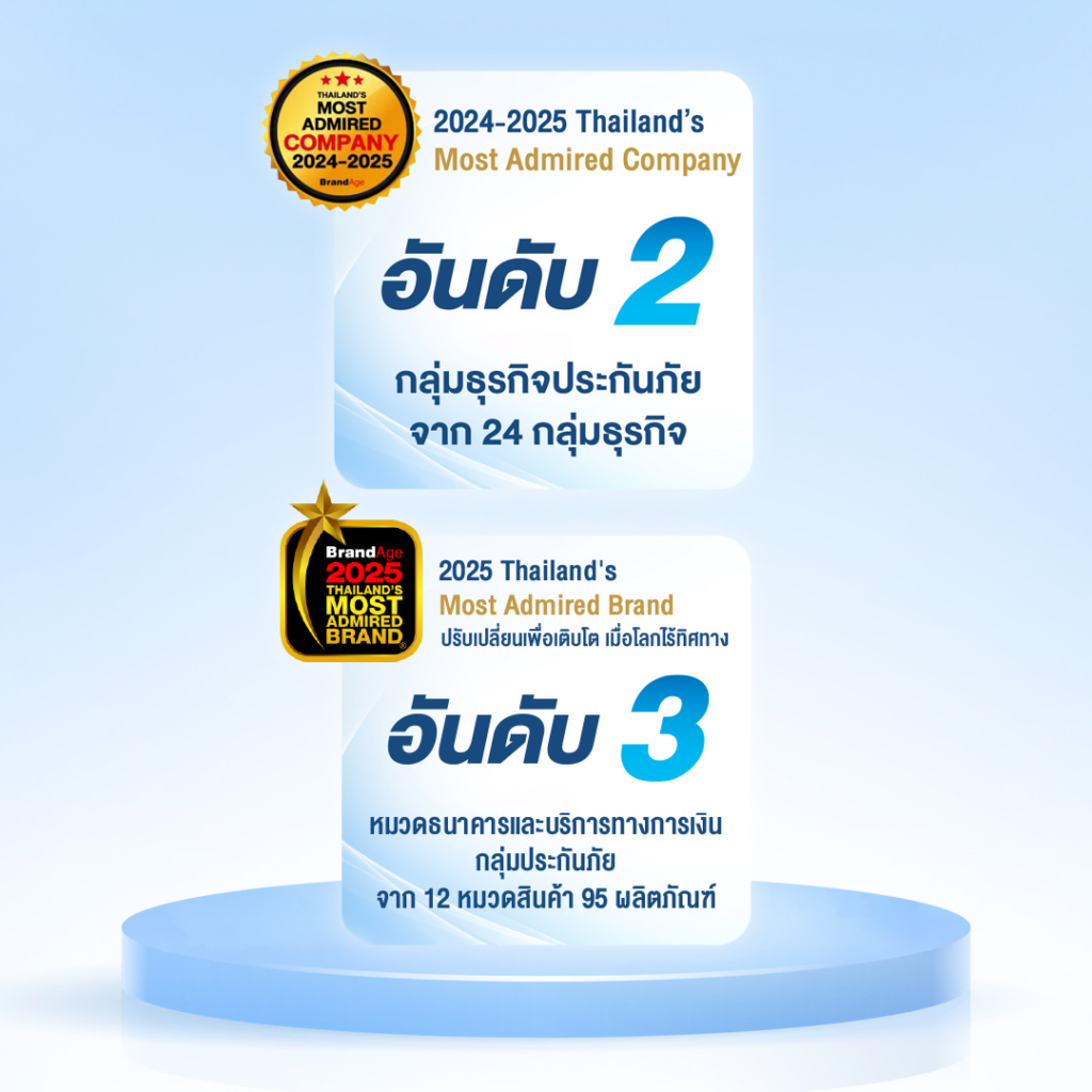 2024-2025 Thailand’s Most Admired Company อันดับ 2 กลุ่มธุรกิจประกันภัย จากนิตยสาร BrandAge และ 2025 Thailand’s Most Admired Brand อันดับ 3 หมวดธนาคารและบริการทางการเงิน กลุ่มประกันภัย จากนิตยสาร BrandAge