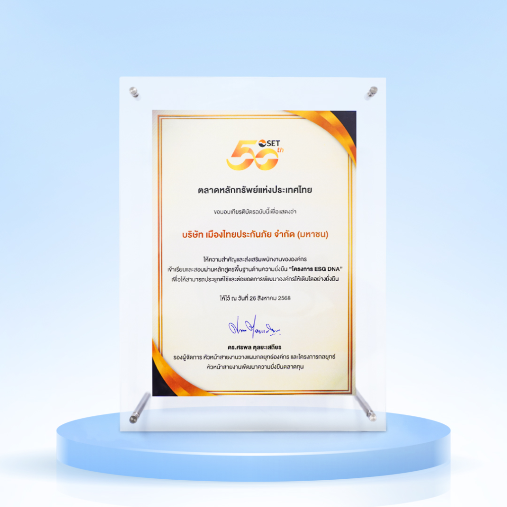 ในฐานะที่ บริษัท เมืองไทยประกันภัย จำกัด (มหาชน) ประสบความสำเร็จในการเข้าร่วม ‘โครงการ ESG DNA ชุดความรู้ด้านความยั่งยืน’