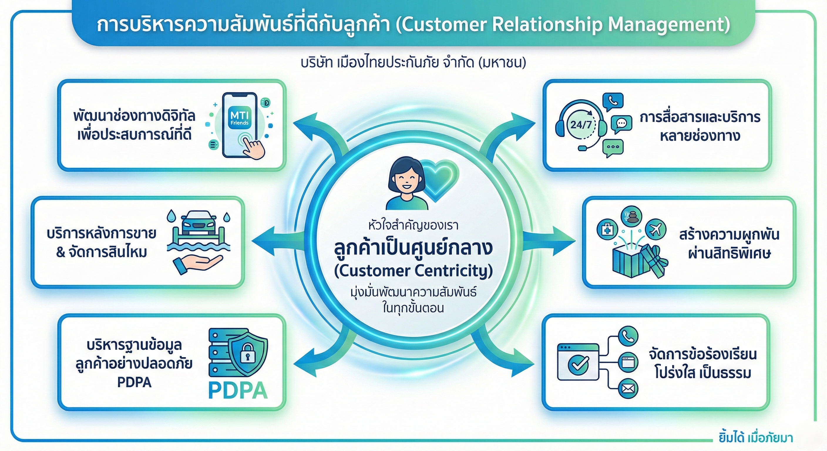 บริษัท เมืองไทยประกันภัย จำกัด (มหาชน) มุ่งมั่นพัฒนาความสัมพันธ์ที่ดีกับลูกค้าในทุกขั้นตอนของการรับประกันภัย ภายใต้หลัก “ลูกค้าเป็นศูนย์กลาง (Customer Centricity)” โดยให้ความสำคัญทั้งด้านคุณภาพบริการ ความโปร่งใส ความรับผิดชอบต่อผู้บริโภค และการพัฒนาประสบการณ์ลูกค้าผ่านนวัตกรรมดิจิทัล เช่น MTI Friends Application, ระบบติดตามสถานะเคลม, Call Center 1484, และศูนย์บริการลูกค้าทั่วประเทศ กลยุทธ์ดังกล่าวเป็นส่วนสำคัญในการขับเคลื่อนองค์กรสู่ความยั่งยืนโดยมุ่งเน้นการสร้างความพึงพอใจ ความไว้วางใจ และความผูกพันระยะยาวกับลูกค้าทุกกลุ่ม